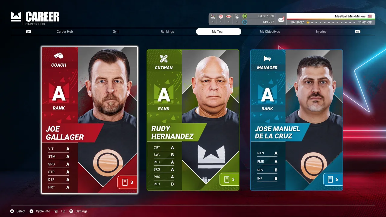 La vitesse d'amélioration dépend de nombreux facteurs : de votre propre condition physique et du centre d'entraînement choisi, mais aussi de la qualité de votre coach. Au début, vous ne pouvez choisir que du personnel de catégorie « E », mais progressivement, vous pouvez échanger votre entraîneur ou votre équipe médicale contre du personnel plus qualifié.